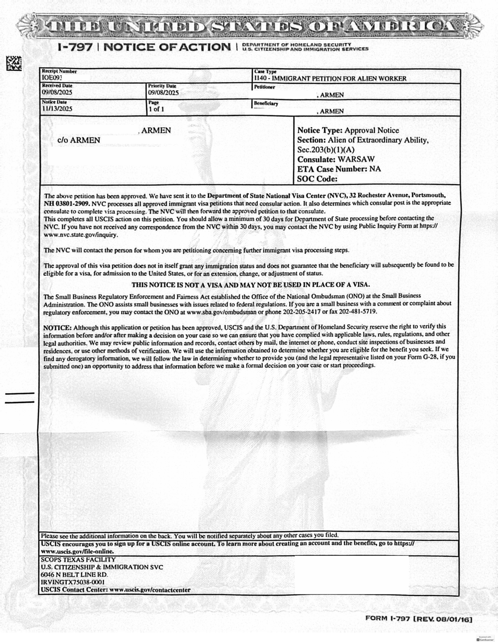 ВИЗА О. ВИЗА ТАЛАНТОВ США